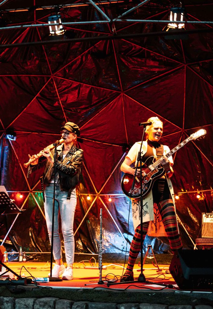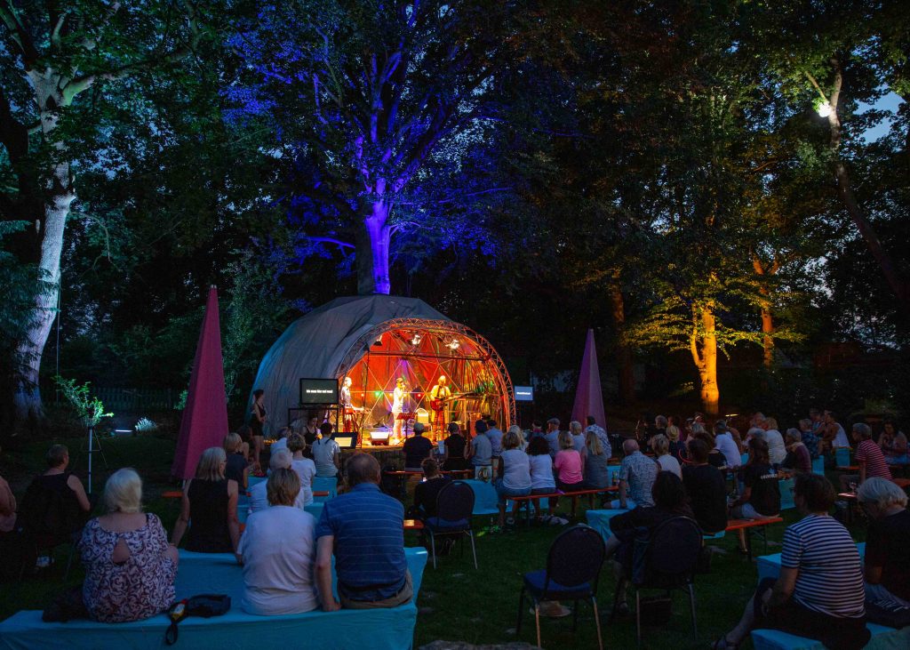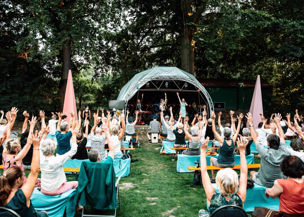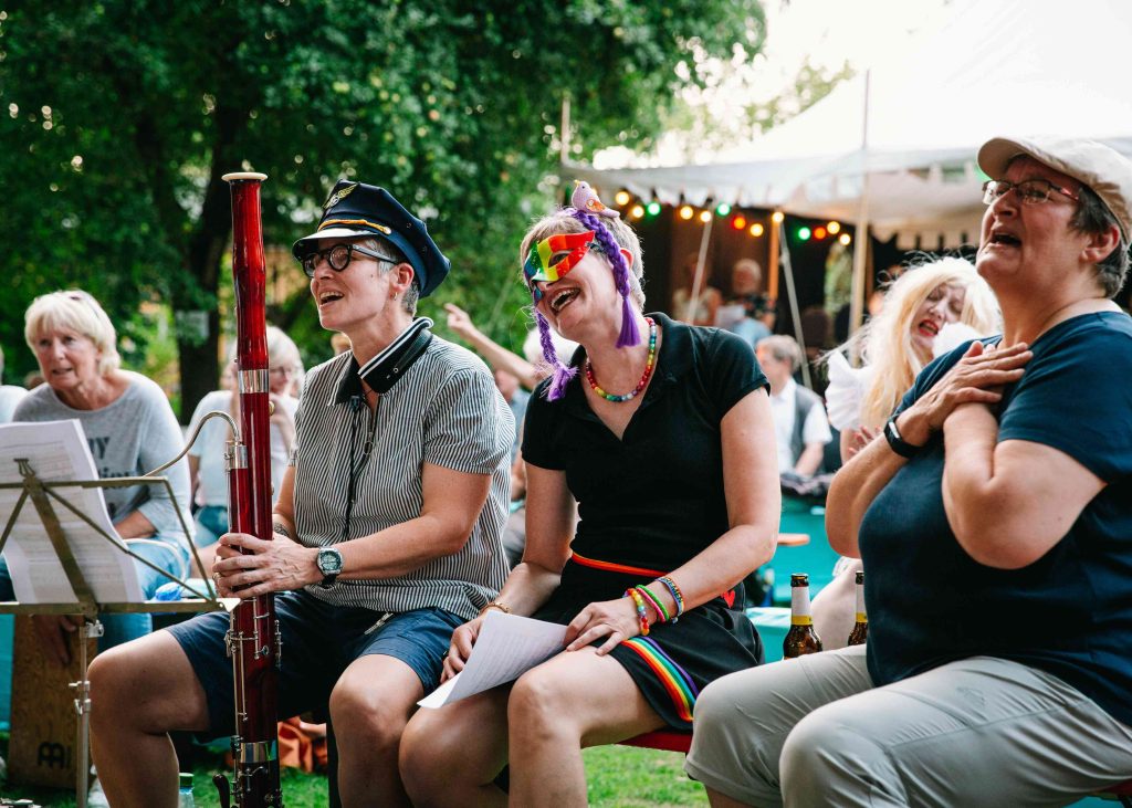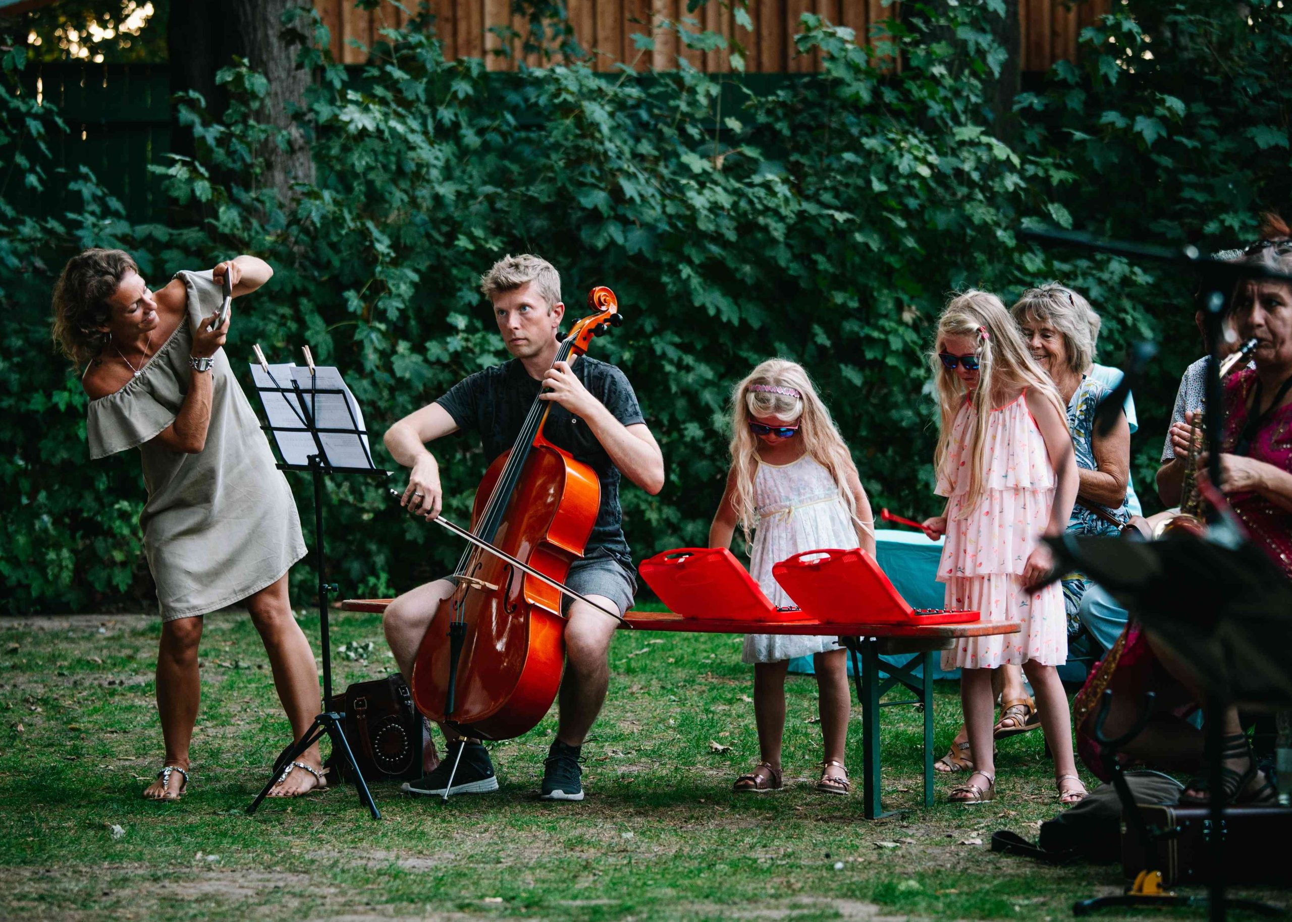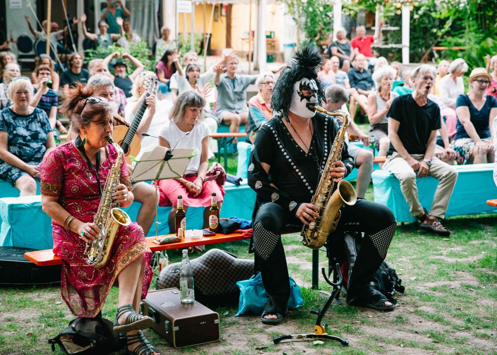 Und dann luden Ramona Ariola & Ramon Locker alle Mitwirkenden des Quarantäne Orchesters zum ersten Zusammenspiel in der echten Welt ein. Am wundervoll lauen Sommerabend des 9. August brachten die Fans Instrumente und Noten mit ins Licht- & Luftbad. Der Text wurde, wie immer, an die Wand geworfen. Früherziehungslehrerin Ramona und ihr gelehriger Blockflötenschüler Ramon verwandelten zusammen mit Keyboarder Bastian Kahrs ein riesiges Chaos in zwei gemeinsam gespielte Songs. Ein beglückender Abend für alle Beteiligten.
