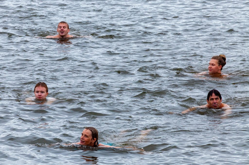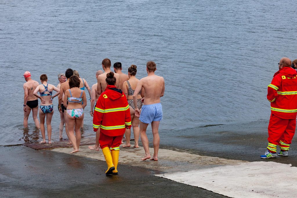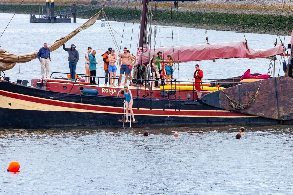 Und erstmals seit 1960 gab es am Lankenauer Höft Freitag und Samstag wieder einen richtigen Zeltplatz. Am Sonntag sogar mit Schwimmgelegenheit, wie früher bei Mudder Wähmann. Unter Aufsicht der DLRG schwammen etwa 30 Schwimmer*innen in mehreren Gruppen im Hafenbecken hin und her zum großen Segelschiff “Ronja”, das Benjamin Feth vom “Klabauterbett” extra als Badeplattform vors Lankenauer Höft gelegt hatte.