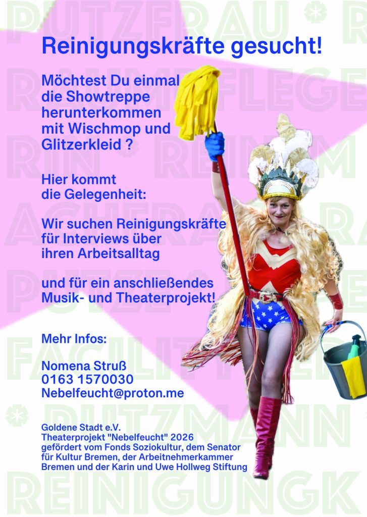 von und mit Nomena Struß und Frauke Wilhelm / März bis Dezember 2026 Mit dem Projekt „Nebelfeucht“ möchten Nomena Struß (Projektleitung, Regie und Schauspiel) und Frauke Wilhelm (Musik, Produktion) die Erfahrungswelt von Reinigungskräften ins gemeinsam mit Mitwirkenden aus der Reinigungsbranche … Weiterlesen