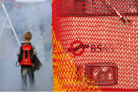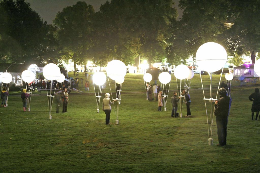 NetzEnergie – Die Wallwiese wurde zur Erfinderwerkstatt: Innerhalb einer raumgreifenden Kunst-Licht-Technik-Skulptur auf der Wallwiese erzeugte ein Netz aus alternativen Energieerzeugungssystemen (Sonnenkollektoren, Windkraft) Strom direkt vor Ort und brachte damit das Herz der Klimafreunde und die Wallwiese zum Leuchten.